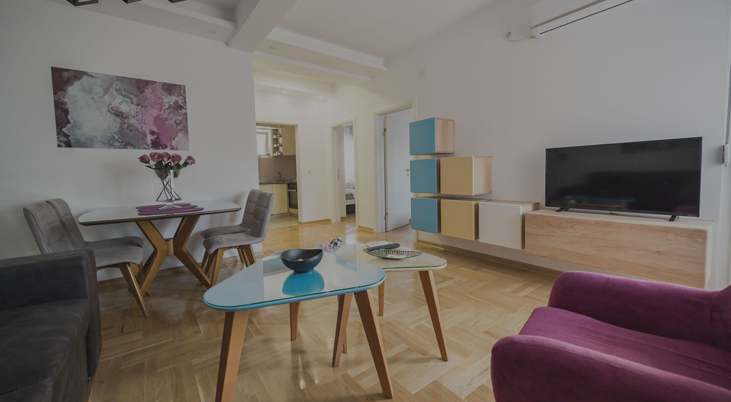 In every apartment, there is a bathroom, a kitchen, two rooms, a living room, a balcony, a parking spot, cable TV, air condition and additional equipment (coffee machine, electric kettle, oven, dishwasher, hairdryer, kitchen utensils, dishes..)